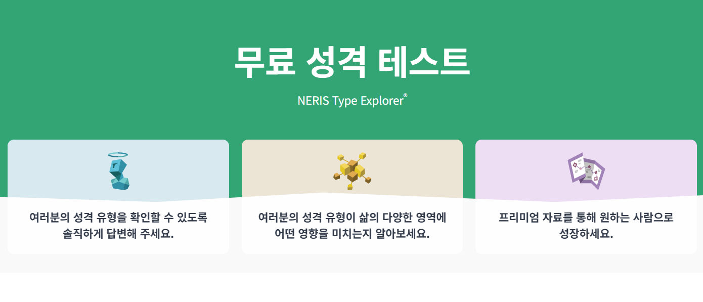 | NERIS Type Explorer | 공식 MBTI와 유사한 구조, 무료, 결과 공유 용이 |
